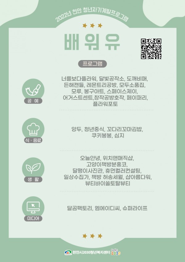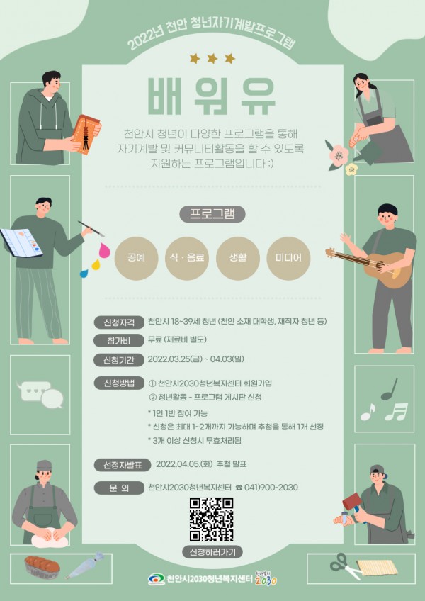 천안시2030청년복지센터에서 청년자기계발프로그램 '배워유' 참여자를 모집합니다.