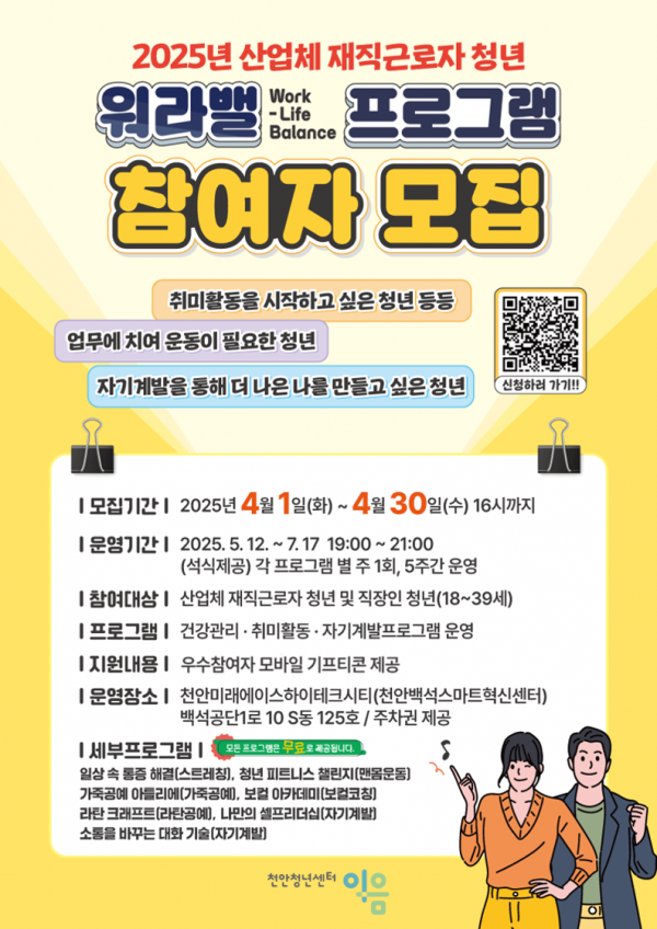 천안시 산업단지 청년들의 일과 삶의 균형을 돕고, 건강한 자기계발과 여가 활동을 지원하기 위해