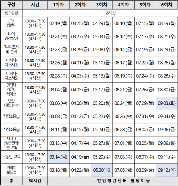 천안 청년(18~39세)의 성공적인 사회 진출을 위한 교육 프로그램(12일, 50시간) 운영 및