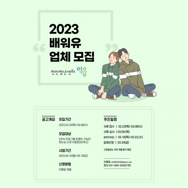 천안청년센터이음에서는 2023년 배워유(대흥) 운영 업체를 모집하오니 많은 신청 바랍니다.