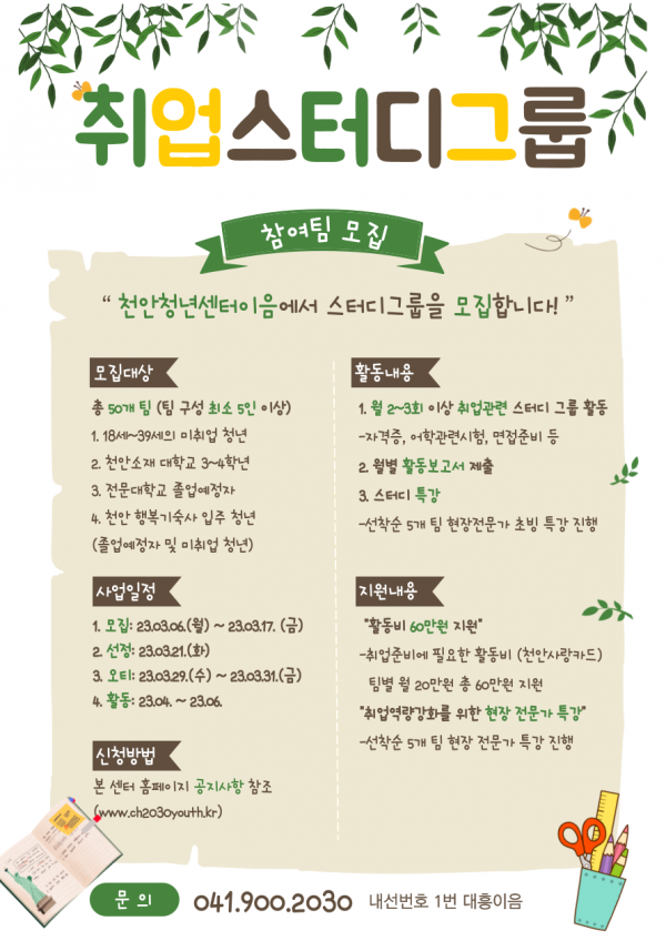 천안청년센터이음에서 천안청년들의 취업을 돕기 위한 취업스터디그룹지원사업의 참여자를 모집합니다.