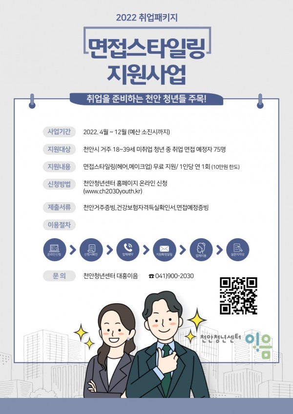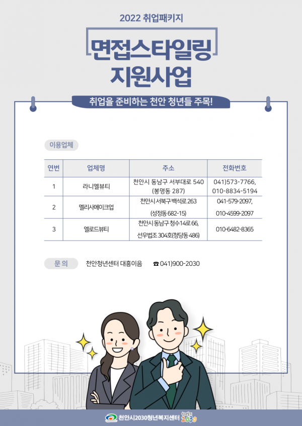 2022년 면접스타일링(헤어·메이크업) 신청자 모집(마감) 페이지 정보 작성일 22-04-01 16:07 본문 2022년 면접스타일링 지원사업 예산소진으로 마감되었습니다. 더 좋은 사업으로 뵙겠습니다 :) 목록 이전글2022년 자격시험응시료 신청자 모집(마감) 22.04.01 다음글생활금융 강사양성과정 참여자 추가 모집 22.03.31